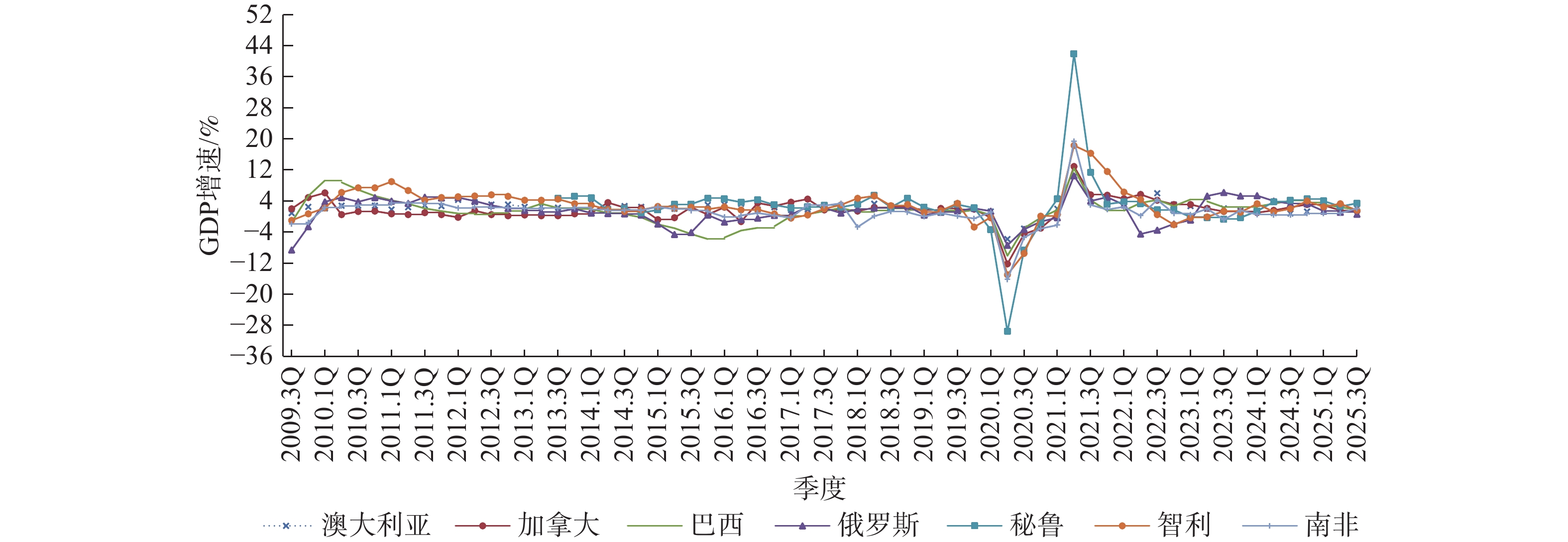 主要矿产资源国经济表现呈现分化。2025年,澳大利亚GDP增速从第一季度的1.4%升至第三季度的2.1%。受到美国关税政策的冲击,加拿大GDP增速从第一季度的1.9%降至第三季度的1.4%。受美国关税政策与原油价格低迷等影响,巴西GDP增速逐季下降,从第一季度的3.1%降至第三季度的1.8%。俄罗斯GDP增速从第一季度的1.4%降至第三季度的0.6%,创两年多来新低,主要受西方制裁与原油价格低迷影响,但贵金属价格上涨在一定程度上缓解了GDP增速下滑压力。秘鲁因国内政局相对稳定,且铜和金等主要矿产品价格上涨,保持了较高的增长速度,第一季度达到4%,第二季度略微回落,但仍然维持3%左右的增长速度。智利作为全球最大铜生产国,受益于铜价持续上涨,GDP增速维持近年来的较高水平。南非则因金等贵金属价格上涨带动矿业产值回升,GDP增速创近年来最高水平(图2)。国际货币基金组织(IMF)预计,2026年秘鲁、澳大利亚、智利增速在2%以上,分别为2.7%、2.1%、2.0%;巴西、加拿大、南非和俄罗斯增速分别为1.9%、1.5%、1.2%、1.0%。