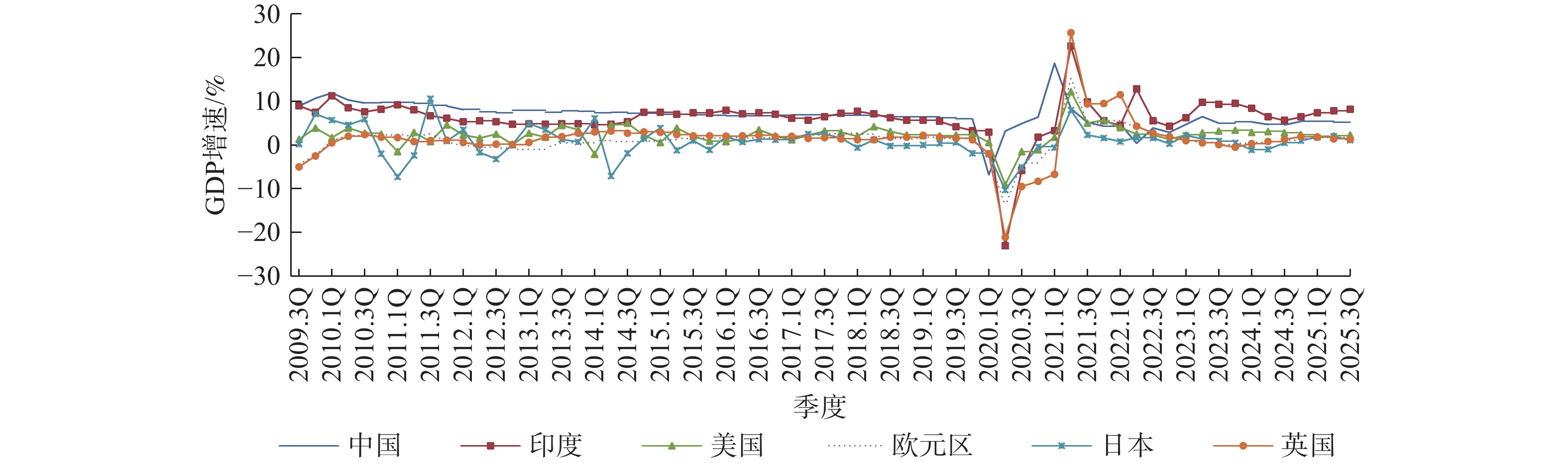 从季度走势看,2025年主要经济体GDP增速呈现差异化特征。美国季度增幅逐季加快,从第一季度的2.0%上升至第二季度的2.1%,第三季度进一步升至2.3%。欧元区增速比较稳定,第一季度、第二季度均为1.7%,第三季度小幅降至1.6%。印度经济增速同样呈现逐季上升的趋势,从第一季度的7.4%增至第三季度的8.2%。英国、中国GDP增速则呈现逐季下降的趋势,英国从第一季度的1.8%降至第三季度的1.3%,中国则从第一季度的5.4%降至第三季度的4.8%。日本第一季度GDP增速为1.8%,第二季度增速达到2.0%,第三季度则回落至1.1%(图1)。