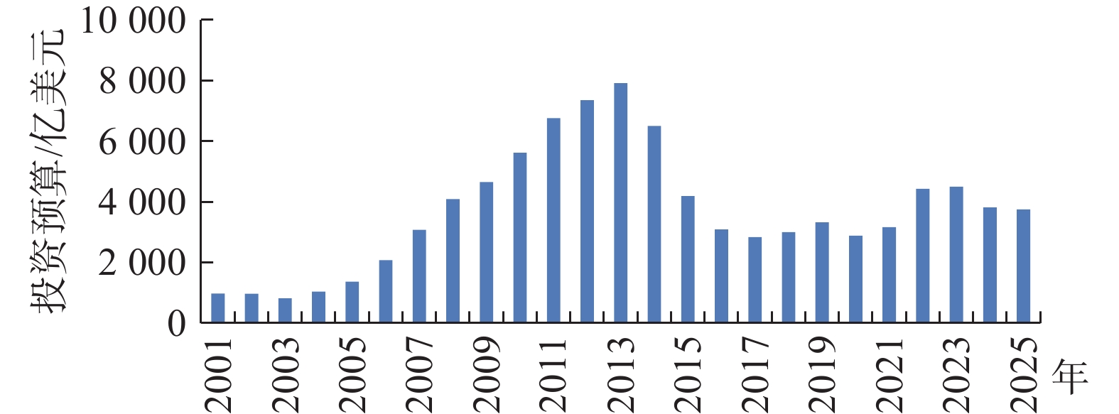 根据美国工业信息资源公司(Industrial Info Resources,IIR)对全球1.2万个矿业(建设、批复/设计、后期计划/许可、概略/可行性研究、勘探)项目的统计,2025年全球矿业总投资近1.5万亿美元,其中,关键矿产项目数占比超1/6,投资规模达4 320亿美元。该公司预计,2025年全球矿山建设投资预算较2024年略微下降(图4)。
