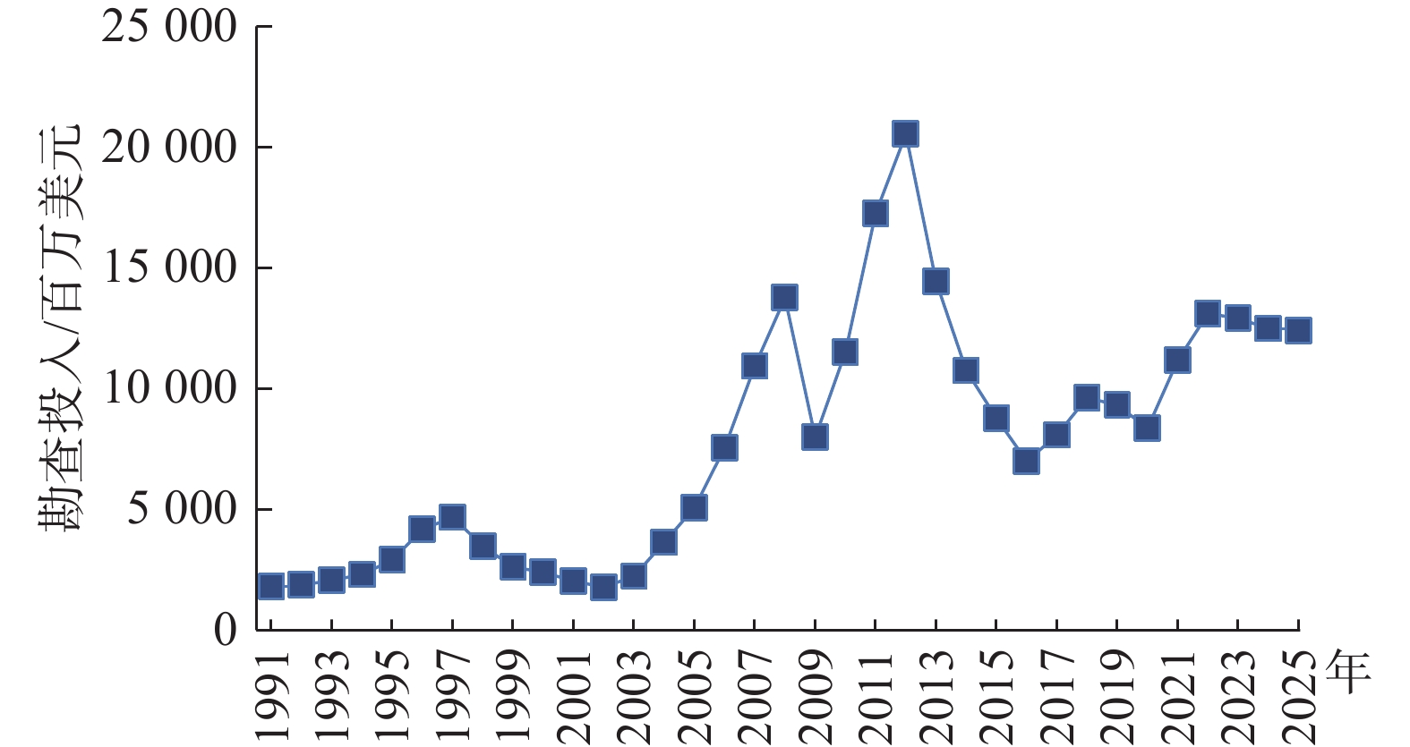 2025年,受矿业公司融资难度持续加大影响,全球矿产勘查投资预算小幅下降。根据标普全球市场财智(S&P Global Market Intelligence)对勘查预算在10万美元以上的2 116家矿业公司的调查统计,这些公司2025年有色金属勘查预算合计约124亿美元,较2024年下降0.6%(图3)。