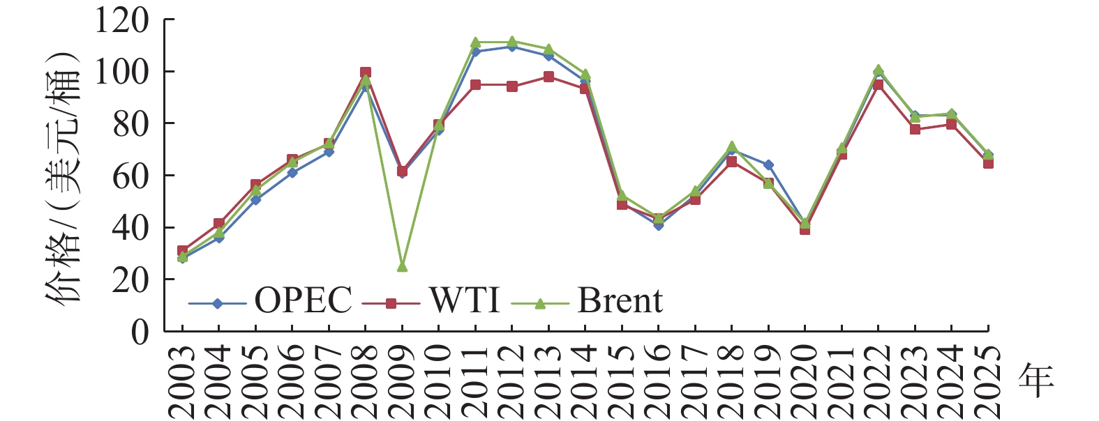 尽管重要石油生产国面临地缘政治危机,但在电动汽车快速普及的背景下,国际油价依然低迷。2025年,欧佩克(OPEC)、西德克萨斯(WTI)和布伦特(Brent)原油均价较2024年呈现两位数跌幅(图5)。欧佩克(OPEC)预测,2026年全球日均石油需求量将较2025年增加138万桶,达1.065亿桶。