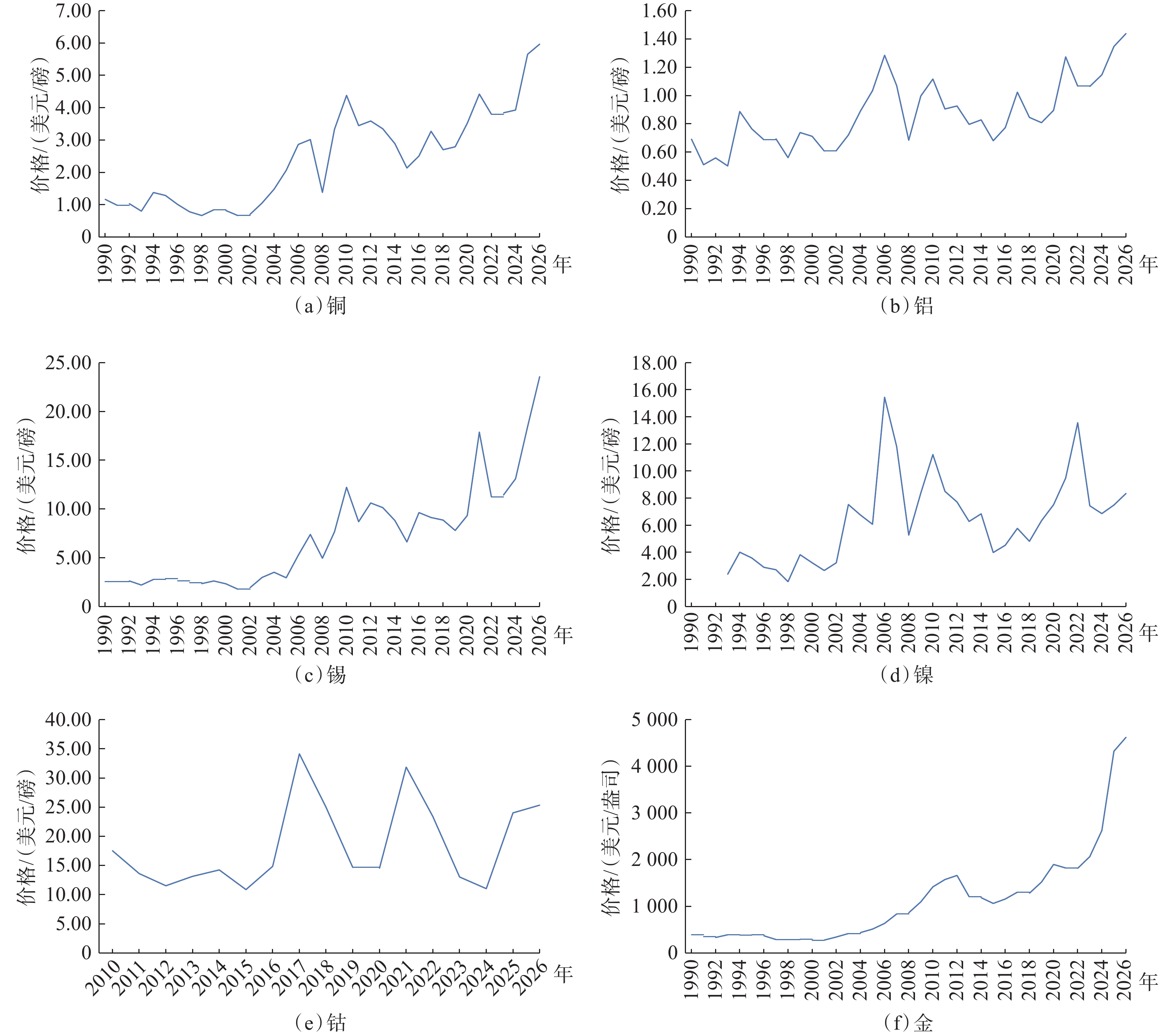 受地缘冲突加剧、各国央行购金强劲、美元贬值等因素影响,2025年国际黄金价格屡创新高,全年涨幅高达64.1%。尽管金矿长期为矿产勘查的核心矿种,但近年来金矿重大发现持续减少,可供开发利用的金矿资源有限,市场供应增量不足。2025年,国际银价涨幅超过1.4倍,是黄金价格涨幅的两倍多。同期,铂价上涨1.268倍,钯价上涨0.828倍。对于2026年金价,美国银行(BOA)预测为4 583美元/盎司,高盛(GS)、摩根大通(JPM)、花旗银行(Citibank)等机构认为将冲击5 000美元/盎司,甚至6 000美元/盎司。