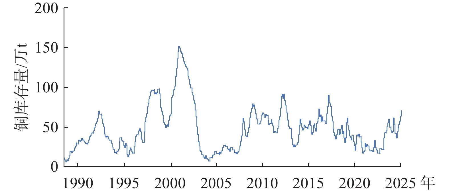 2025年,主要有色金属价格整体呈单边上扬趋势(图6)。与2025年初相比,2025年底伦敦金属交易所(LME)铜价上涨42.3%,锡价上涨39.94%,镍价上涨9.41%,铝价上涨17.3%,铅锌价格上涨约3%。受全球最大地下铜矿——特尼恩特(Teniente)铜矿事故等因素影响,2025年前11个月智利铜产量为487万t,同比下降1.3%。2025年,纽约金属交易所(COMEX)、伦敦金属交易所(LME)、上海期货交易所铜库存量持续回升,已经达到七年来最高水平(图7)。除智利外,全球前三大铜生产国中的刚果(金)受矿山事故影响产量下滑,秘鲁也面临生产压力。对于2026年铜价,智利铜业委员会(Cochilco)预测为4.55美元/磅,美国银行(BOA)预测为5.13美元/磅,瑞银集团(UBS)预测为5.22~5.90美元/磅,花旗银行(Citibank)预测为5.90美元/磅。
